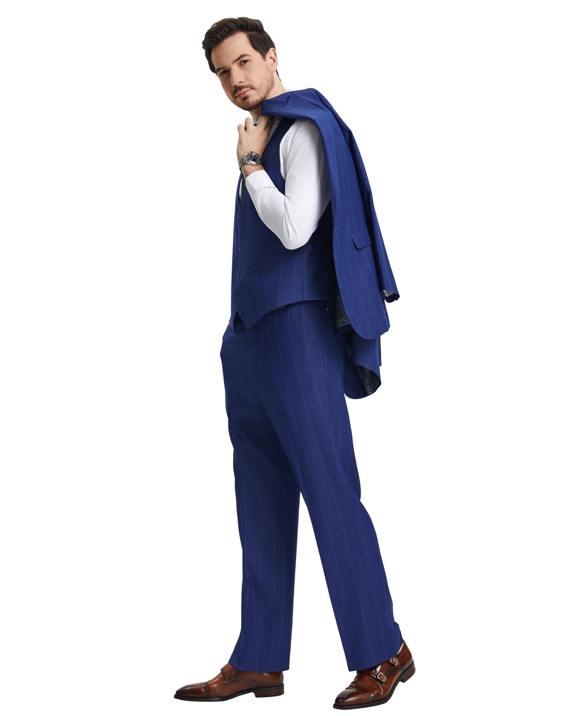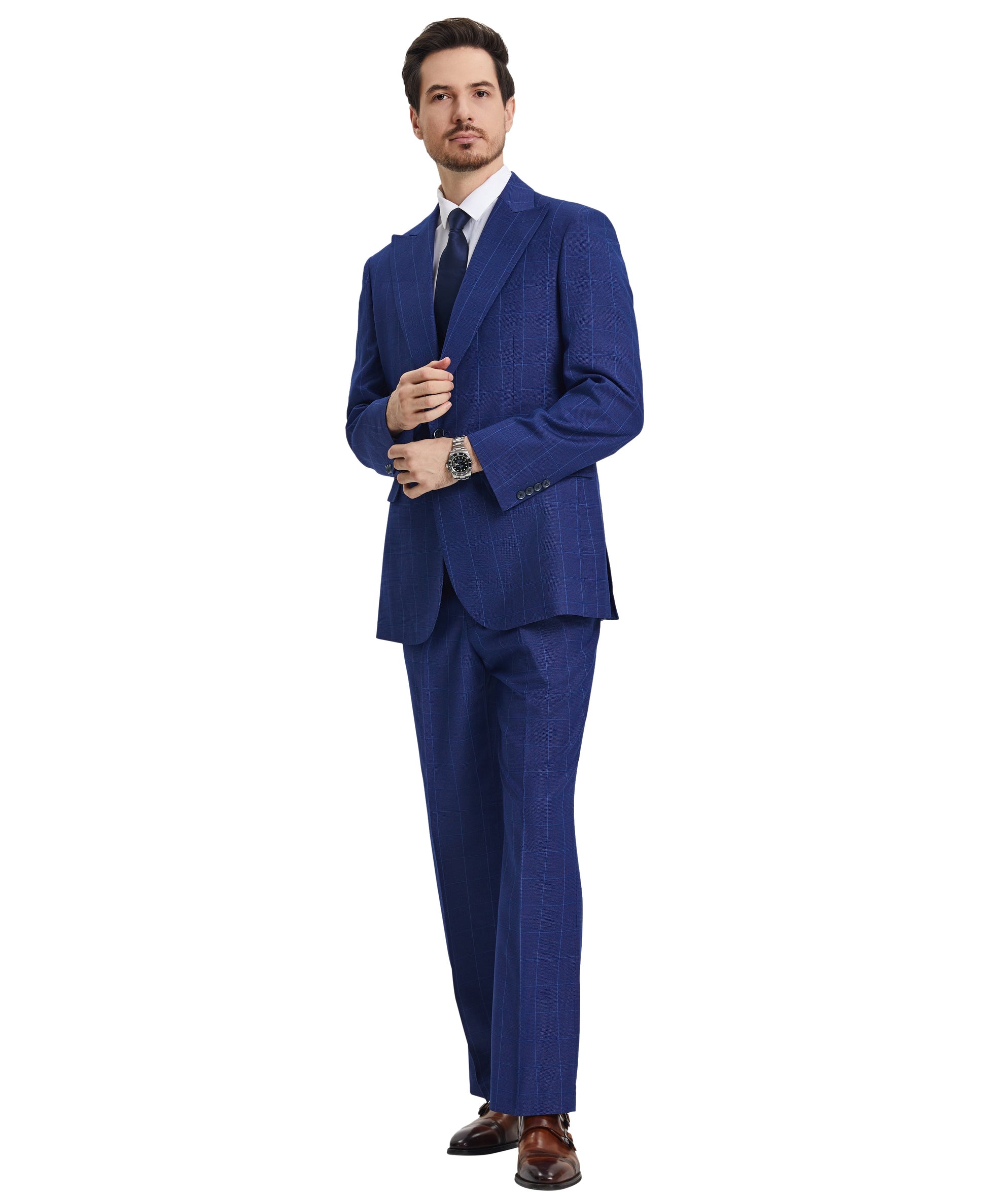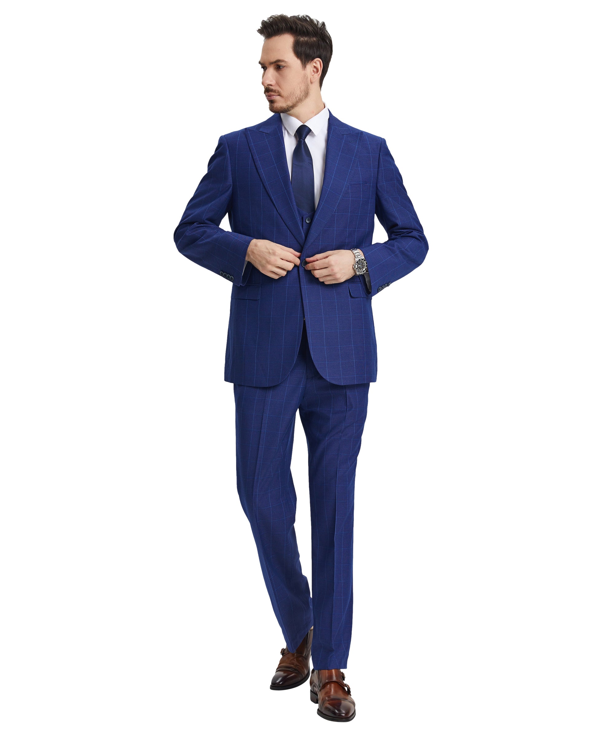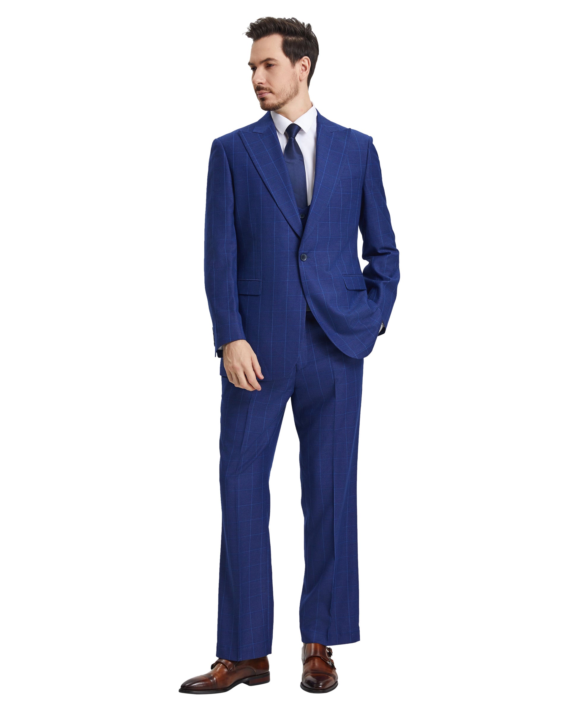 Experience elevated formal style with Stacy Adams Hybrid-Fit Vested Suit in Windowpane Royal Blue - a three-piece silhouette that amalgamates traditional elegance with contemporary sophistication. Boasting one-button closure, peak lapel and a striking Windowpane Royal Blue pattern, you'll be oozing confidence and charm at galas, weddings and business meetings. The Hybrid-Fit strikes the balance between comfort and precision, while its flat-front pants and four-button U-shaped vest provide a sleek look and timeless charm. With this suit, you're sure to leave a lasting impression.